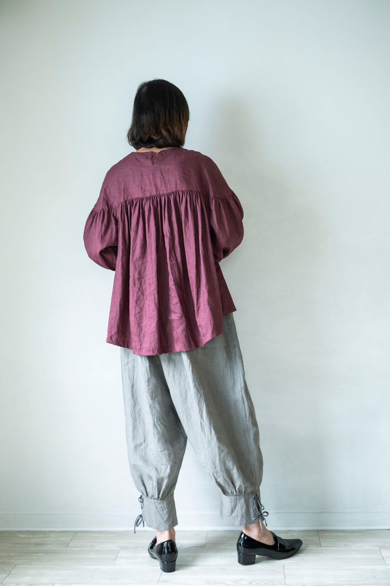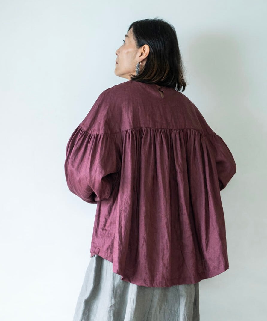 胸元ギャザーを生かしたたっぷり生地を添えましたにもかかわらずさらっと軽い品に仕上がりました。ぜひご体感してみてください♪